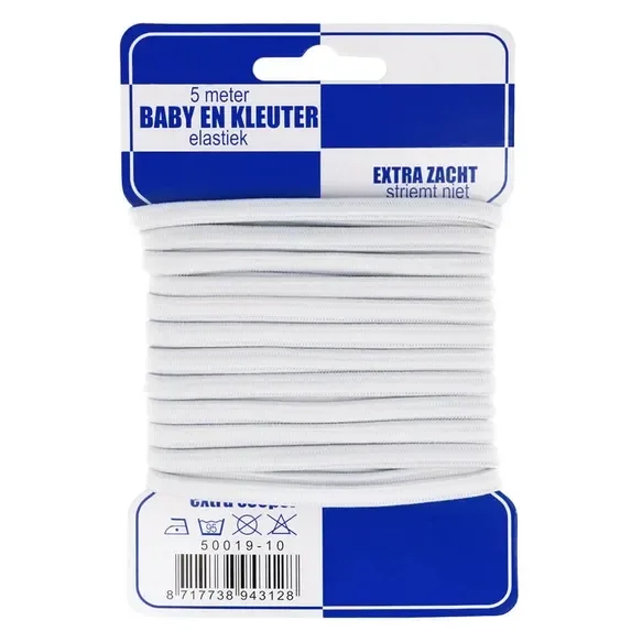 Baby- en kleuterelastiek is extra soepel en extra zacht, waardoor het vriendelijk is voor de huid en geschikt is bij extra gevoeligheid voor druk. Dit elastiek is kookecht en striemt niet. Het elastiek is wasbaar tot 95°C. Een verpakking bevat 5 meter elastiek. Verkrijgbaar in wit, blauw en roze.